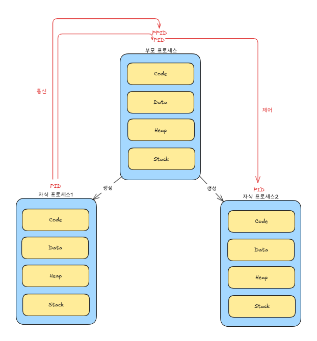 - 보통 각 프로세스(부모 프로세스)는 자식 프로세스로 분기되거나, 병렬 작업을 위해 따로 생성됨