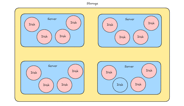 - 예시: 4대의 서버, 각 서버에 4개의 디스크 → 총 16개의 디스크를 하나의 스토리지로 사용