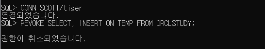 >> ORCLSTUDY에 부여된 TEMP 테이블 사용 권한 취소하기