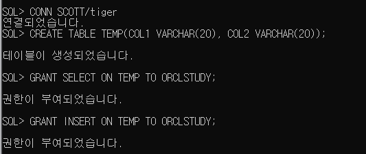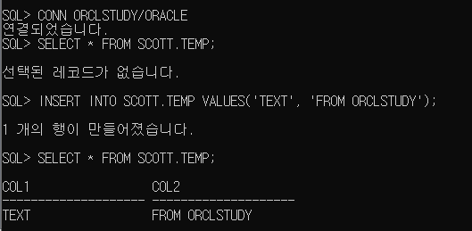 >> ORCLSTUDY 사용자의 소유는 아니지만 SCOTT 계정의 TEMP 테이블을 조회하고 INSERT도 가능해짐